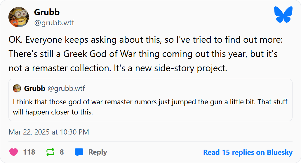 در گذشته، بخش بزرگی از سری بازی God of War در یونان اتفاق میافتاد و بر اساطیر یونانی تمرکز داشت. این روند از نسخههای اولیه تا قبل از تغییر فضا به اساطیر نورس در بازی God of War سال ۲۰۱۸ ادامه یافت. با وجود اینکه کوری بارلاگ (Cory Barlog)، کارگردان بازی God of War، گفته بود که برنامهای برای سهگانه دوم بر پایه نسخه ۲۰۱۸ نداشته، اما پایان بازی God of War Ragnarok موقعیتی را فراهم کرد که امکان روایت داستانهای تازه در آینده وجود داشته باشد. گراب در پلتفرم Bluesky اشاره کرد که این پروژه جدید از سری بازی God of War در رویداد اخیر State of Play معرفی نشد، اما شاید در جشن بیستمین سالگرد فرنچایز رونمایی شود. کمپانی سونی پیشتر برخی برنامههای بزرگداشت این سالگرد را اعلام کرده بود که شامل محتوای تازه در بازی God of War Ragnarok، عرضه محصولات جدید مرتبط با این مجموعه و برپایی نمایشگاهی هنری به شکل فیزیکی است.