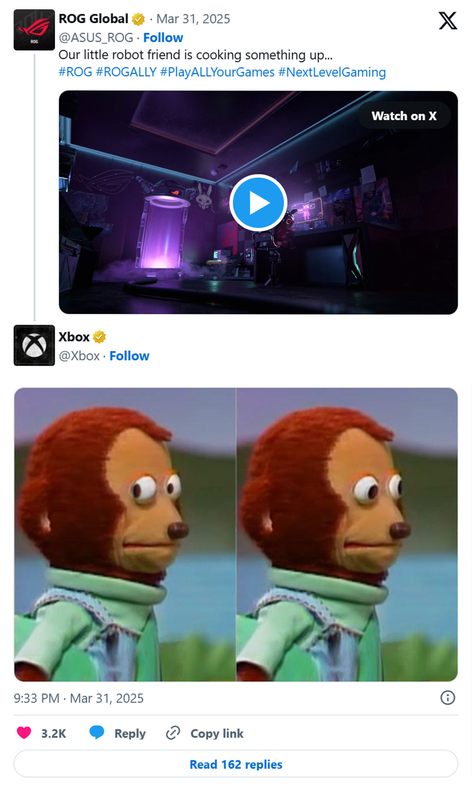 با توجه به این ویدیو، به نظر میرسد ایکس باکس نیز متوجه ماجرا شده. در توییتر، حساب رسمی ایکس باکس با انتشار تصویری از میم معروف «میمون کنجکاو» به این ویدیو واکنش نشان داد. اگرچه هنوز هیچ چیز به صورت رسمی تایید نشده، اما این احتمال وجود دارد که نسخه جدید ROG Ally با سیستم عامل Windows عرضه شود و حتی کمپانی مایکروسافت در توسعه آن مشارکت داشته باشد.