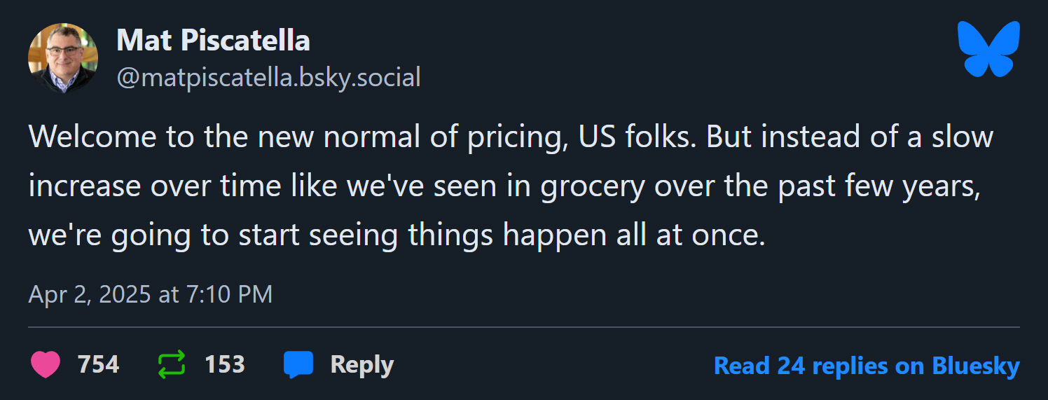 پیسکاتلا در پلتفرم Bluesky نیز نگرانی خود را درباره عادی شدن قیمت ۸۰ دلاری بازیها ابراز کرده و آن را با افزایش تدریجی هزینههای خرید مواد غذایی مقایسه کرده است. او میگوید در حالی که طی چند سال گذشته، گرانی مواد غذایی به شکل تدریجی احساس میشد، در حوزه بازیهای ویدیویی با روند سریعی مواجه خواهیم بود که گویی تمام فشار تورمی و هزینهها به یکباره روی دوش مصرفکننده تحمیل میشود. با این حال، پیسکاتلا بر این باور است که افزایش قیمت بازیها تاثیر محسوسی در میزان فروش عناوین و کنسولهای نینتندو در سال اول نخواهد گذاشت. به عقیده او، خانوارهایی با درآمد بالا و همچنین «طرفداران سرسختی» که حاضرند هر هزینهای را برای تهیه کنسول و بازیهای محبوب خود متقبل شوند، در سال نخست بخش عمدهای از مشتریان را تشکیل خواهند داد و با وجود عرضه محدود دستگاه در ماههای اولیه، این گروهها تمام نیاز بازار سال اول را تامین خواهند کرد.