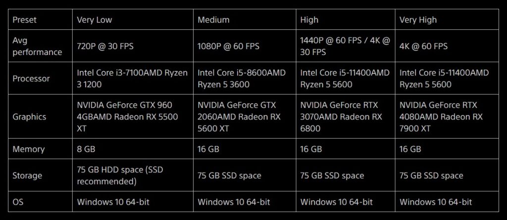 سیستم موردنیاز برای پایین ترین حالت (720p/30fps) گرافیکی متوسط است که شامل 8 گیگابایت رم همراه با پردازنده I3 -7100 یا Ryzen 3 1200 و همچنین کارت گرافیکی GTX 960 (4GB VRAM) یا Radeon RX 5500 XT میشود. در طرف دیگر وبرای بالاترین حالت گرافیکی (4k/60fps) نیز شما به 16 گیگابایت رم در کنار پردازنده i5-11400 یا Ryzen 5 5600 به همراه کارت گرافیک GeForce RTX 4080 یا Radeon RX 7900 XT نیاز خواهید داشت.