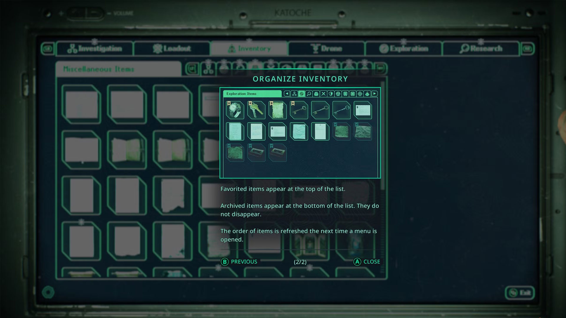 به همین دلیل، مدیریت وسایل را باید از همان ابتدای بازی جدی بگیرید. با اینکه ممکن است تا اواخر بازی آموزش رسمی آن ظاهر نشود، اما شما از همان ابتدا میتوانید آیتمهای غیرضروری را آرشیو کنید. این کار باعث میشود آن آیتمها خاکستری شوند و به پایین فهرست منتقل گردند، تا آیتمهای مهمتر در دسترستان باقی بمانند.