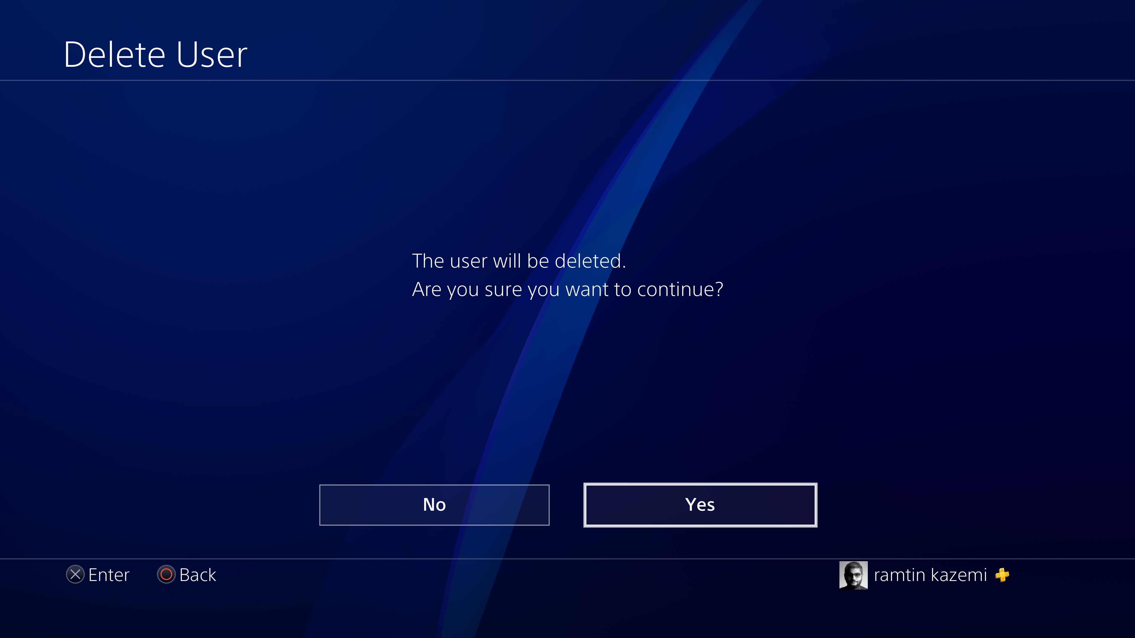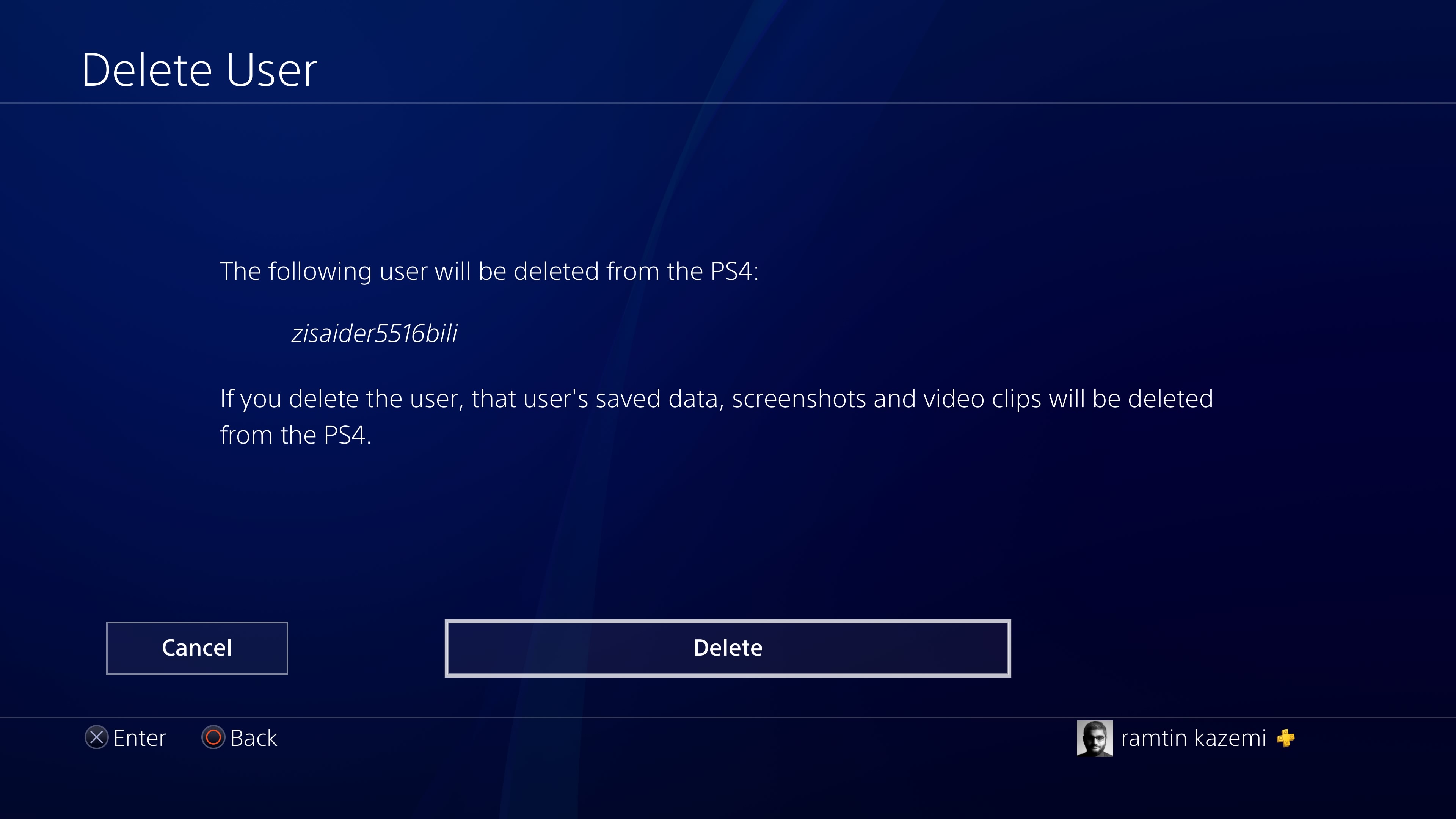 توجه کنید که با پاک کردن یک حساب کاربری در پلی استیشن 4، تمام اطلاعات آن از جمله فایلهای سیو، عکسها و فیلمهایش نیز پاک خواهند شد مگر اینکه اطلاعات کاربر در فضای ابری ذخیره شده باشند (برای این کار به اشتراک پلی استیشن پلاس نیاز دارید). گزینه Delete را بزنید.