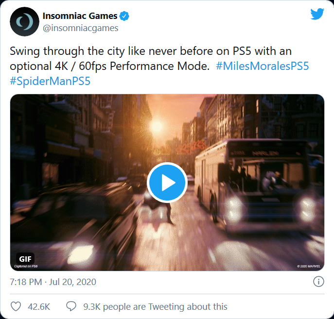 حساب رسمی استودیو Insomniac در صفحه توییتر خود بعد از به وجود آمدن شایعات بسیار در رابطه با اجرا شدن عناوین بازی در حالت 30 فریم در ثانیه در پلی استیشن 5، به این موضوع واکنش نشان داد و اعلام کرد که بازی Spider-Man Miles Morales تنظیمات گرافیکی متنوعی خواهد داشت و یکی از آنها مربوط به اجرا شدن بازی در حالت 60 فریم در ثانیه و وضوح تصویر 4K خواهد بود.