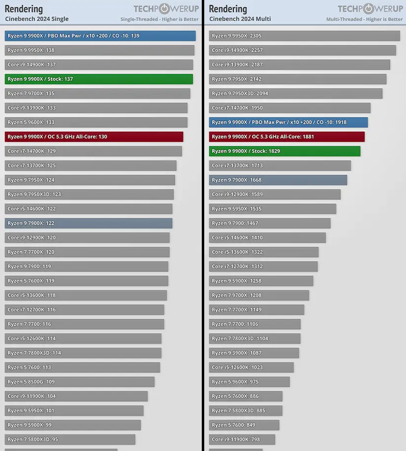 برای تست رندر، از برنامه Cinebench 2024 استفاده کردهایم که خودکمپانیهای اینتل و AMD برای تست پردازندهها و به رخ کشیدن قدرت سی پی یوهایشان از آن استفاده میکنند و به استاندارد صنعت برای تست سی پی یو تبدیل شده است. با استفاده از این تست ما هم عملکرد تک رشتهای و هم عملکرد چند رشتهای پردازنده AMD Ryzen 9 9900X را اندازه گرفتهایم.