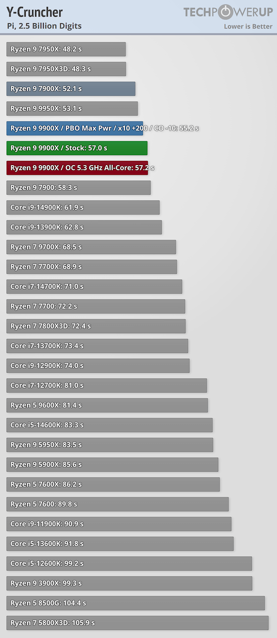 برای اولین تست این سی پی یو از برنامه Y-Cruncher کمک گرفتهایم. این نرم افزار یکی از محبوبترین نرم افزارها برای اورکلاکرها است و از آن برای اندازه گیری عملکرد چند رشتهای پردازندهها استفاده میشود. این برنامه درواقع عدد P و دیگر اعداد ثابت را تا رقم بسیار زیادی محاسبه میکند و اورکلاکرها از این برنامه برای به رخ کشیدن سیستم اورکلاک شدهاشان استفاده میکنند. با دیدن نتایج این تست متوجه می شوید که تغییرات ساختاری AMD واقعا به بهبود عملکرد این پردازندهها، خصوصا مدلهای بالا رده کمک کرده است. این تست با استفاده از یک هسته، عدد P را تا مقادیر زیادی محاسبه میکند که برای این تست، تا 2.5 میلیارد رقم را محاسبه کرده است.