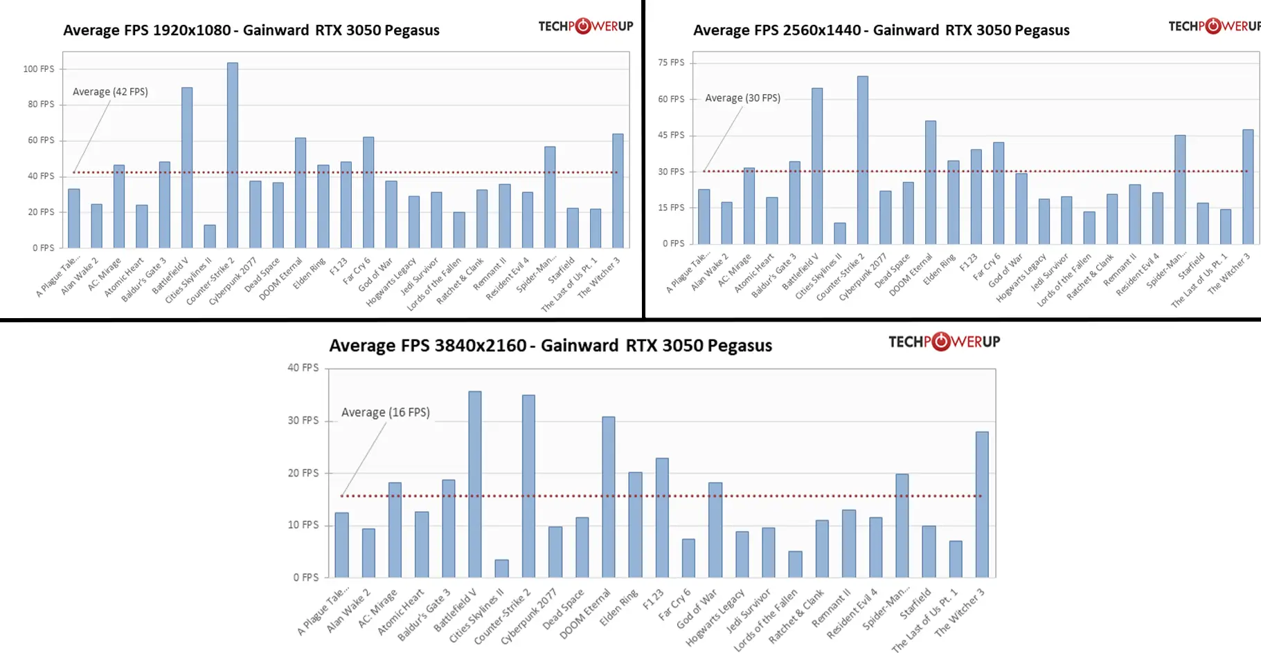 با کارت گرافیک Asus Dual GeForce RTX 3050 میتوانید انواع بازیها را با رزولوشن 1080p تجربه کنید. همانطور که در تصویر زیر مشاهده میکنید، متوسط فریم این کارت گرافیک در 7 بازی در رزولوشن 1080p و با تنظیمات اولترا، 56.9 فریم بوده که به نرخ 60 فریم بر ثانیه بسیار نزدیک است. حال اگر کمی تنظیمات بازیها را بهینه کنید، به نرخ فریم بیشتر از 60 هم دست پیدا خواهید کرد. البته که اجرای بازیها با تنظیمات اولترا فایده چندانی ندارد، زیرا معمولا تفاوت جزییات با تنظیمات High اصلا حس نمیشود و صرفا نرخ فریم خود را پایین میآورید. بازیهای مورد تست شامل بازی Borderlands 3، بازی Far Cry 6، بازی Flight Simulator، بازی Forza Horizon 5، بازی Horzion Zero Dawn، بازی Red Dead Redemption 2 و بازی Watch Dogs Legion میشود. سیستمی که تستها با آن انجام شده است از پردازنده Intel Core i9-12900K و 16 گیگابایت رم 3600 DDR4 استفاده میکند. در ادامه میتوانید بنچمارک این کارت گرافیک را در مقایسه با دیگر کارتها مشاهده کنید: