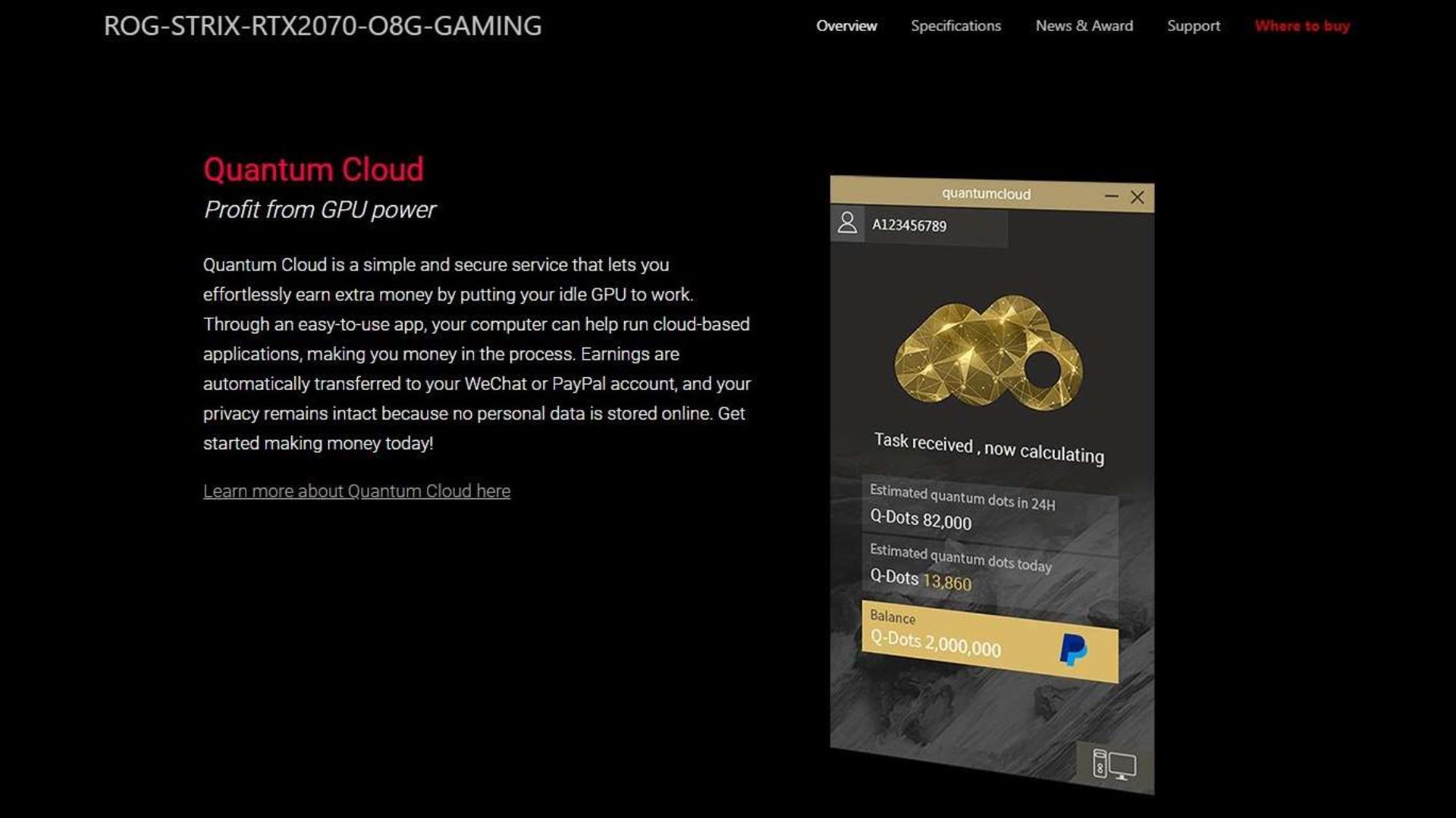 شرکت Asus دسترسی به نرمافزار QuantumCloud را برای کاربران ایجاد کرده است. این نرمافزار یک برنامه کاربردی ایمن و آسان است که برای کاربران اجازه میدهد به اشتراک گذاشتن قدرت پردازش گرافیک خود در حالت غیر فعال، درآمدزایی کنند. درآمدهای به دست آورده شده از طریق این نرمافزار با برنامههایی مانند PayPal یا دیگر پلتفرمها پرداخت میشود و هیچ اطلاعات شخصی جمع آوری نمیشود.