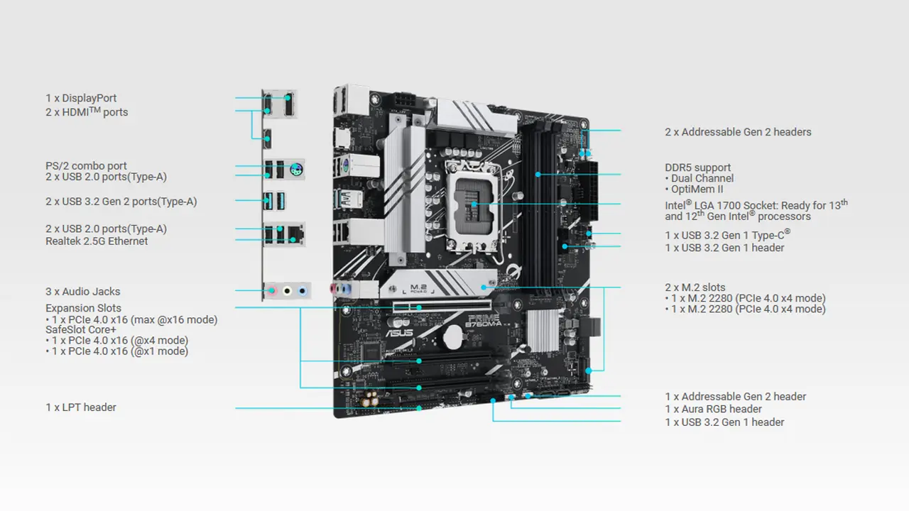 مادربردهای سری B کمپانی Intel برای آن دسته از افرادی است که اورکلاکرحرفهای نیستند و به یک مادربرد میان رده که نیازهایشان را برطرف کند،نیاز دارند. مادربرد Asus Prime B760M-A از سوکت LGA 1700اینتل پشتیبانی میکند و میتوانید پردازندههای نسل 12 (Alder Lake) و 13(Raptor Lake) اینتل را روی آن نصب کنید. این مادربرد از 128 گیگابایت رم DDR5 تا سرعت 7200+ مگاترنسفر و حداقل سرعت 4800 مگاترنسفر و از پروفایلIntel XMP پشتیبانی میکند. همچنین این مادربرد از دو جایگاه برای SSD NVMe M.2 PCIe 4، شش پورت USB و قابلیتهای بسیار دیگر دارد.