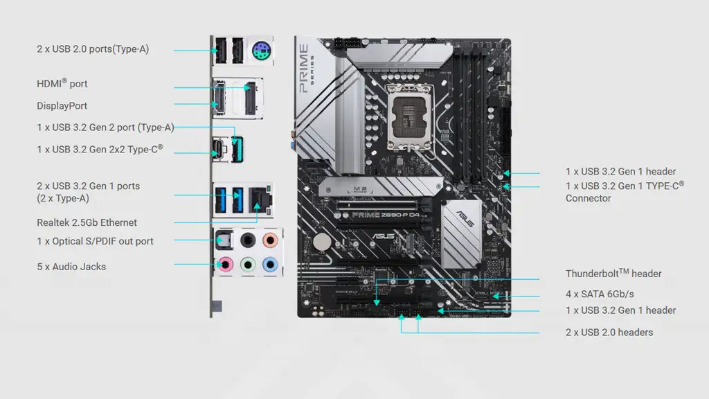 ایسوس در مادربرد Asus Prime Z690-P کم نگذاشته است و به شما گزینههای ذخیرهسازی متعددی پیشنهاد میدهد. این مادربرد از چهار پورت SATA III، دو هدر USB 2، دو کانکتور USB 3.2 Gen 1 و یک هدر USB 3.2 Gen 2 (Type C) بهره میبرد.