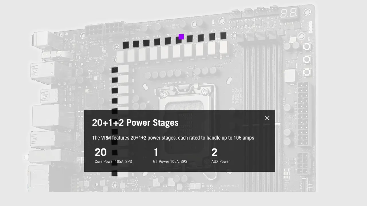 چیپست Z790 مادربردهای اینتل، از جمله چیپستهای بالا با قابلیتهایی مخصوص اورکلاکرها است. ماژول تنظیم ولتاژ (VRM) این مادربرد، از مدار تغذیه2+1+20 فازی و 105 آمپری برای Vcore سی پی یو و SOC سیستم بهره میبرد.کار VRM درواقع رگولات کردن برقی است که از پاور به سمت پردازنده شمامیرسد. پردازندهها معمولا تا 1.5 ولت توان دریافت برق دارند، در حالی که برق ارسالی از پاور 12 ولت است. در اینجا ماژول تنظیم ولتاژ یا همان VRMوارد عمل میشود و قبل از این که این برق به پردازنده برسد، آن را تمیزمیکند و برق مورد نیاز پردازنده را به آن تحویل میدهد. در کل یادتان باشد که هرچه یک VRM فاز بیشتری داشته باشد (همان عدد اول)، فرصت بیشتری برای تمیز کردن برق دارد و به همین دلیل برای اورکلاک کردن به پاوری با فازهای زیاد نیاز دارید که مادربرد مذکور، از 20 فاز برای برق رسانی به پردازنده و رم استفاده میکند. به همین دلیل این مادربرد برای اورکلاک کردن مناسب است و با این تعداد فاز VRM میتوانید با خیال راحت پردازنده خود را اورکلاککنید. البته یادتان باشد که برای اورکلاک پردازنده نیاز به خرید خنککننده پردازنده قدرتمند دارید!