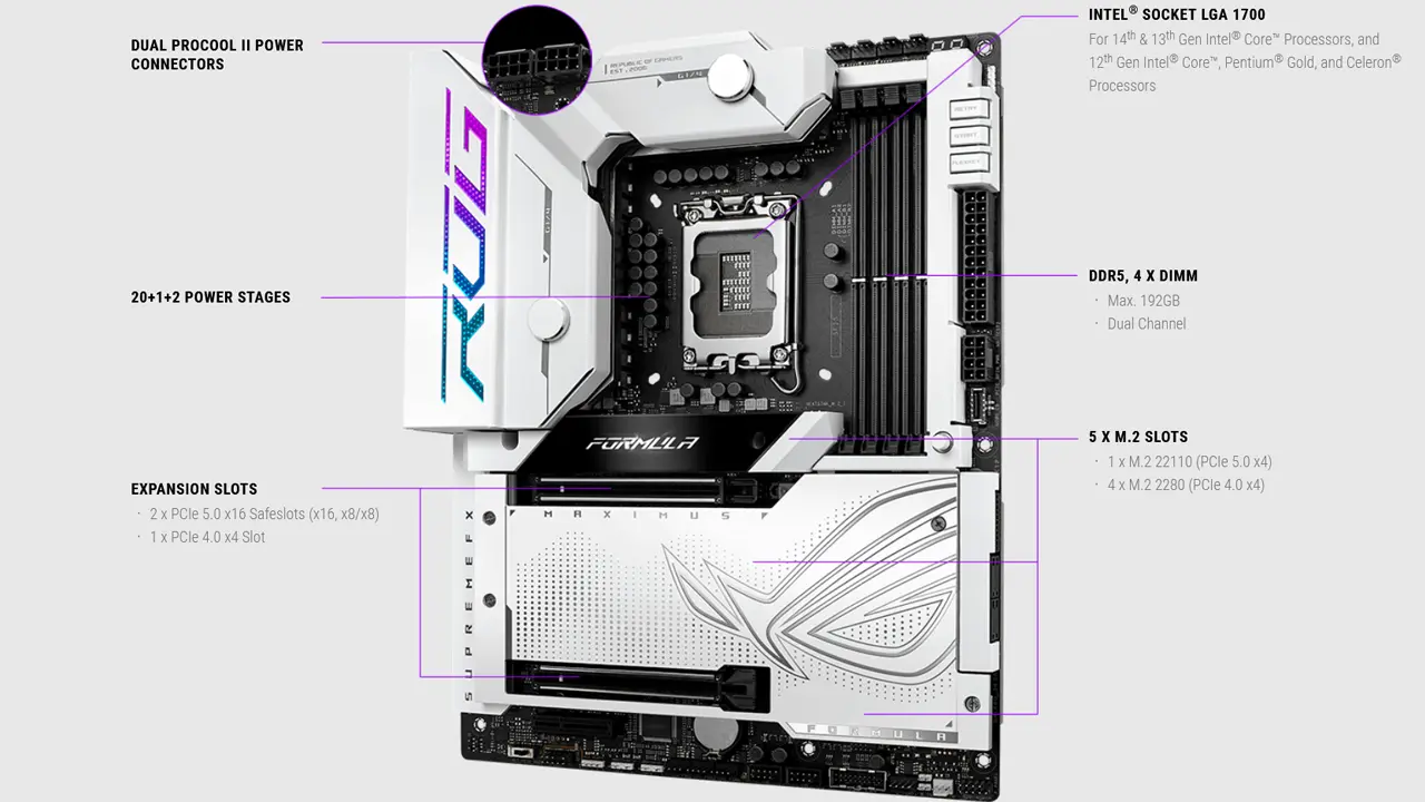 مادربرد ROG Maximus Z790 Formula از چیپست LGA 1700 اینتل پشتیبانی میکند که در نتیجه میتوانید از سری ۱۲،۱۳و 14 اینتل را روی این مادربرد نصب کنید.