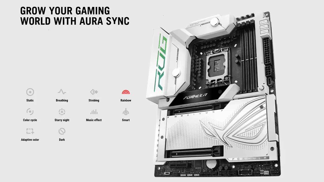 شما میتوانید با استفاده از برنامه Armoury Crate ایسوس، نورپردازی این مادربرد را کنترل کنید و لوگوی ROG ایسوس را با رنگهای متفاوت به نمایش بگذارید. این لوگو روی هیتسینکهای VRM این مادربرد هستند. به لطف سیستم Aura Sync ایسوس میتوانید نورپردازی این مادربرد را با دیگر محصولات ایسوس مانند کارت گرافیکهایش هماهنگ کنید و سیستمی یک دست و زیبا داشته باشید.
