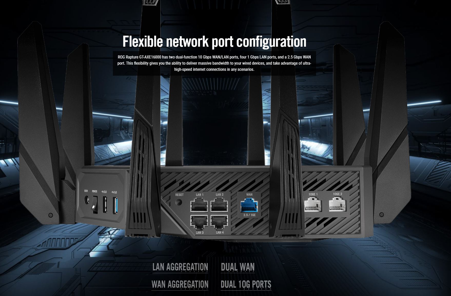 روتر ROG Rapture GT-AXE16000 دارای دو پورت WAN/LAN دوکاره 10 Gbps، چهار پورت LAN 1 Gbps و یک پورت WAN 2.5 Gbps است. این انعطافپذیری امکان ارائه پهنای باند زیاد به دستگاههای متصل به صورت کابلی را فراهم میکند. این ویژگی به کاربران این امکان را میدهد که از حداکثر سرعت اینترنت خود بهرهبرداری کنند و به راحتی دستگاههای مختلف را به شبکه متصل کنند. این پیکربندی متنوع همچنین به کاربران اجازه میدهد تا در شرایط مختلف، از جمله بازیهای آنلاین و استریمهای ویدیویی، بهترین عملکرد را تجربه کنند. با توجه به اینکه بسیاری از کاربران به دنبال اتصالهای سریع و پایدار هستند، این ویژگیها به طور چشمگیری تجربه کاربری را بهبود میبخشد و رضایت کاربران را افزایش میدهد.