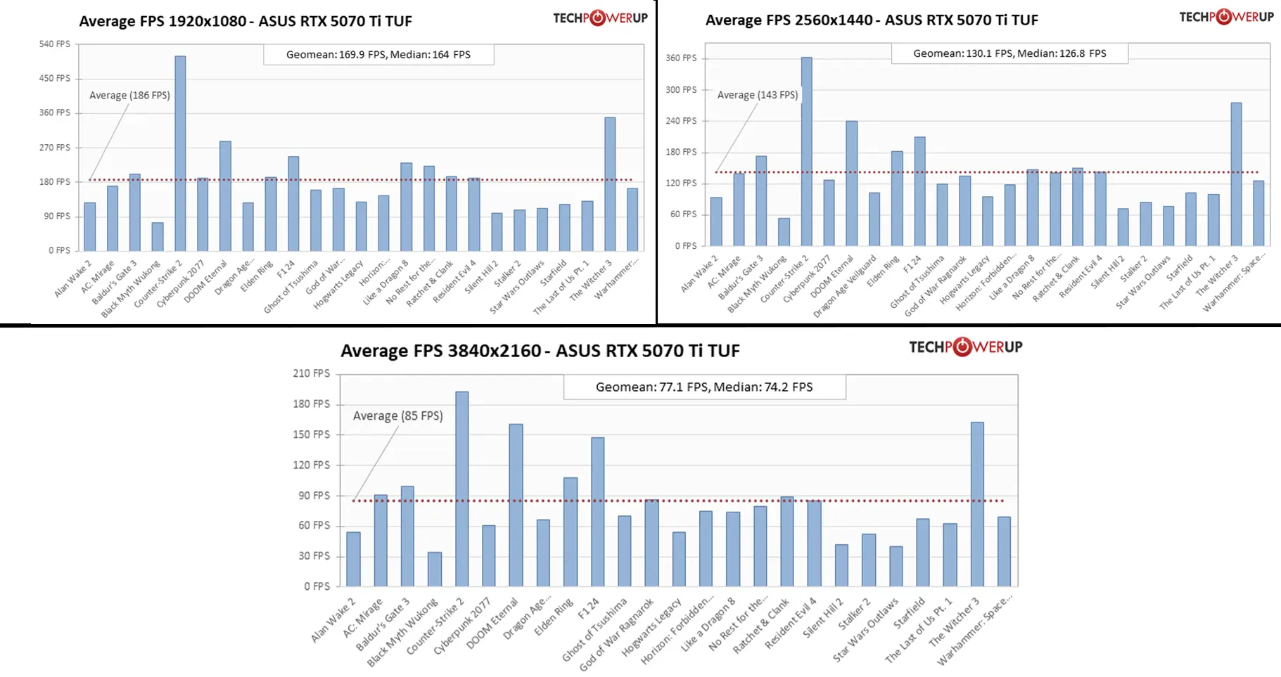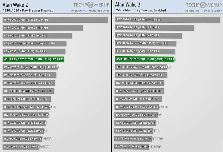 کارت گرافیک Asus TUF Gaming GeForce RTX 5070 Ti ، برای اجرای بازیها با رزولوشن 4K ساخته شده است. اگر قصد خرید مانیتور 4K دارید یا این که هماکنون صاحب یکی از آنها هستید، این کارت گرافیک قدرت کافی برای اجرای بازیها با نرخ فریم مناسب را در رزولوشن 4K دارد. ما برای این بخش از بنچمارک سایت TechPowerUp استفاده کردهایم که نرخ فریم این کارت گرافیک را در 25 بازی مختلف تست کرده است که در آن بین عناوینی چون God of War، بازی Cyberpunk 2077، بازی Baldur's Gate 3 و بازی Alan Wake 2 به چشم میخورد. سیستمی که این سایت برای تست این کارت گرافیک از آن استفاده کرده است مجهز به یک پردازنده AMD Ryzen 7 9800X3D، مادربرد MSI X870E Carbon Wi-Fi و رم 32 گیگابایتی 6200 مگاهرتزی است.