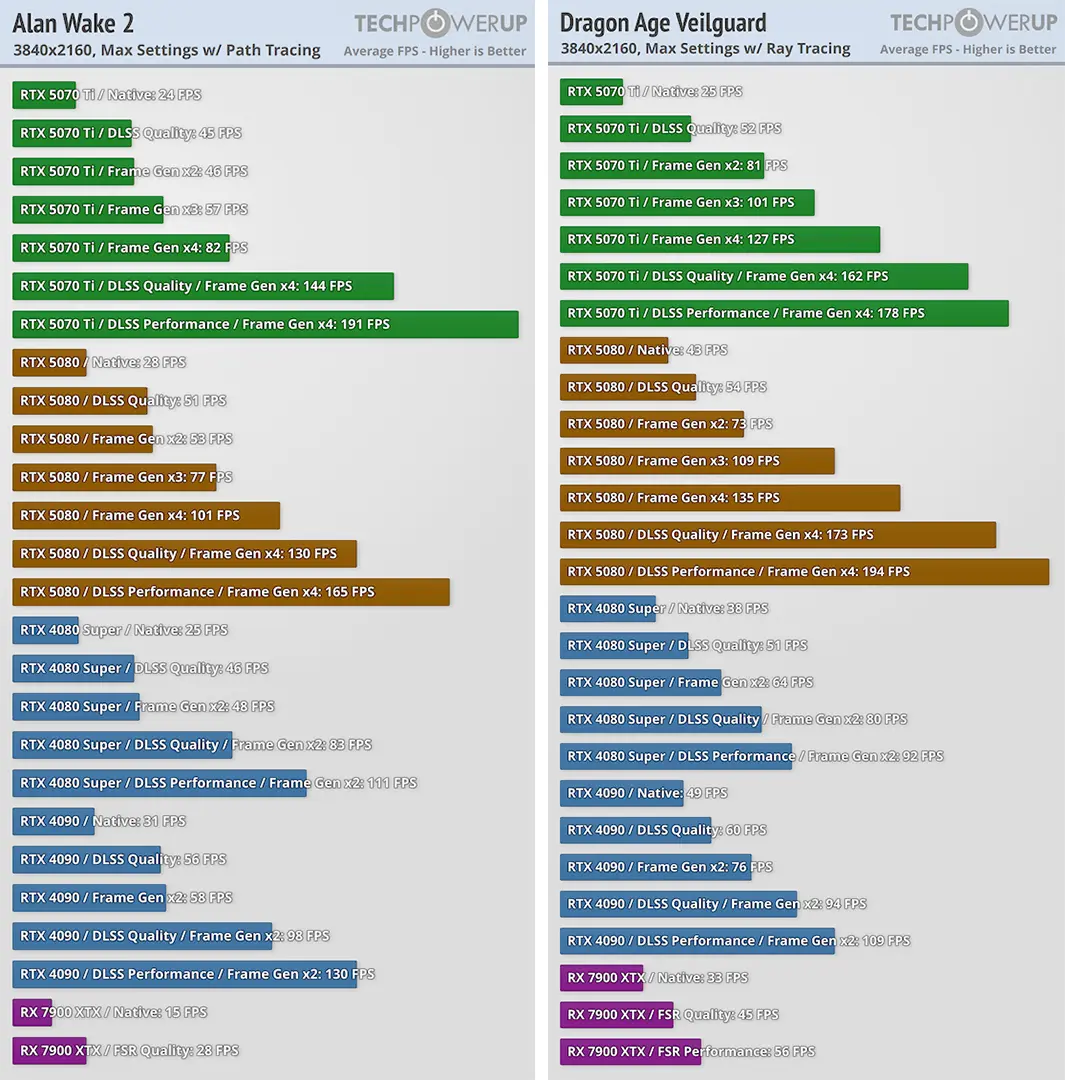 همانطور که گفتیم، رهگیری پرتو نور امروزه مهمترین تکنولوژی در دنیای بازیهای ویدویی است و سری 50 کارت گرافیکهای انویدیا هم به لطف هستههای رهگیری پرتو نور نسل چهارم، در این امر بسیار بهینهتر هستند و اکنون دستیابی به این قابلیت ممکن شده است. البته که این تکنولوژی حتا برای قویترین کارت گرافیکها هم در رزولوشنهای بالا سنگین محسوب میشود و در اینجا است که تکنولوژی هوش مصنوعی انویدیا یا همان DLSS وارد میدان میشود. DLSS رسما در افزایش نرخ فریم معجزه میکند، البته با کارت گرافیک Asus TUF Gaming GeForce RTX 5070 Ti برای اجرای بازیها در رزولوشن 4K همراه با رهگیری پرتو نور هم احتمالا نیازی به ان ندارید و میتوانید با آن به نرخ فریم 120 دست پیدا کنید. در ادامه عملکرد این کارت گرافیک را در رزولوشن 4K بررسی خواهیم کرد و به کمک این بنچمارکها تصویر کاملتری از قدرت این کارت گرافیک برایتان ترسیم خواهد شد. در این قسمت از بنچمارک سایت TechPowerUp استفاده کردهایم که از بازیهای Dragon Age Veilguard و بازی الن ویک 2، در مدهای مختلف بنچمارک گرفتند.