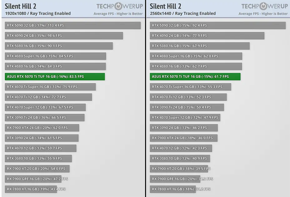 بازی بعدی تست ما، Silent Hill 2 است. مشخص است که با این کارت گرافیک میتوانید با روشن کردن گزینه رهگیری پرتو نور با رزولوشن 2K نرخ فریم خوبی دریافت کنید و اصلا نیازی به DLSS نیست.