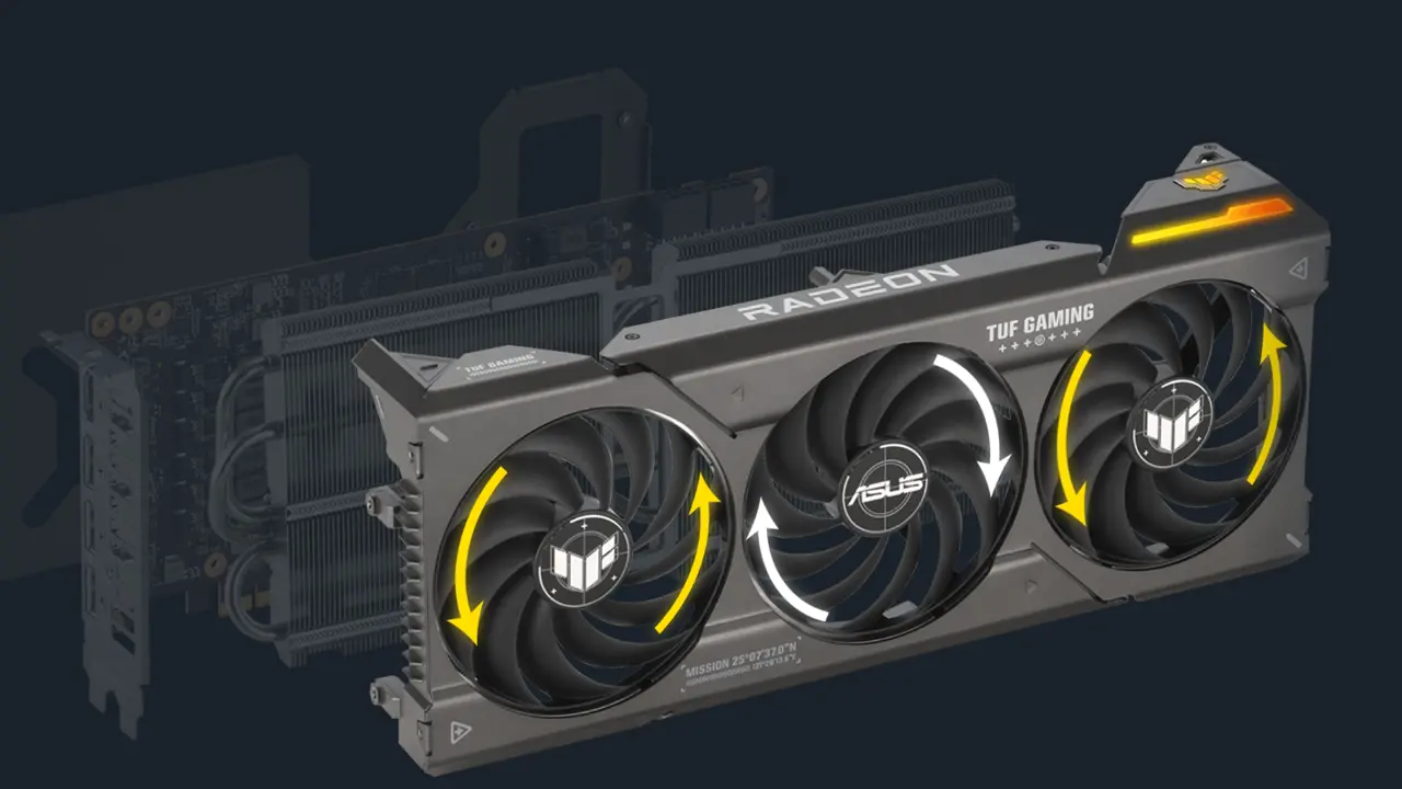 فنهای کارت گرافیک Asus TUF Gaming Radeon RX 7800 XT از نوع ساچمهای هستند و به همین دلیل عمر طولانیتر و نویز کمتری دارند. این فنها در دمای زیر 55 درجه خاموش میشود و در حین اجرای بازیهای سبک یا کارهایی که به پردازش گرافیکی سنگین نیازی نداشته باشند، کاملا با یک کارت گرافیک ساکت طرفاید که هیچ صدایی از خود ساطع نمیکند. فنهای این کارت گرافیک در دمای بالای 60 درجه دوباره شروع به چرخیدن میکنند. البته میتوانید خودتان با استفاده از نرم افزار ایسوس، پروفایلهای شخصی تعریف کنید که فنها در چه دمایی، با چه سرعتی بچرخند. فنهای مجاور کارت گرافیک Asus TUF Gaming Radeon RX 7800 XT در خلاف جهت یکدیگر میچرخند. با این کار هوا با فشار بیشتری گردش پیدا میکند و در نتیجه گردش هوای موثرتری هم ایجاد میشود. کمپانی ایسوس برای این کارت گرافیک از هیت سینک بزرگتری استفاده کرده است که گرما را جذب و سپس به فنها منتقل کنند تا کارت گرافیک دمای پایینتری داشته باشد.