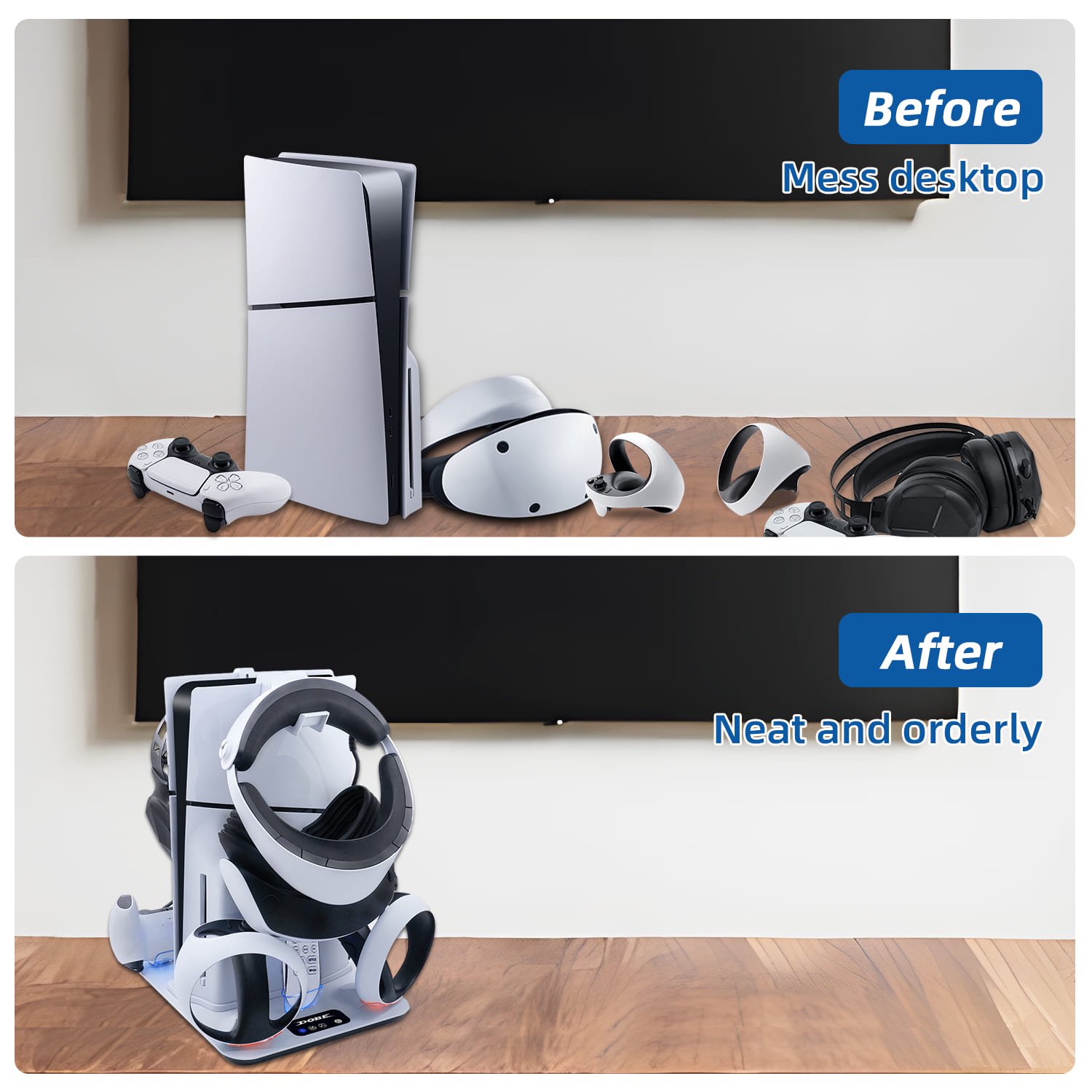 صرفهجویی در فضا و نظم با یک ابزار که کنترلر، هدست و ریموت را نگهداری میکند و کنسول را ثابت نگه میدارد.