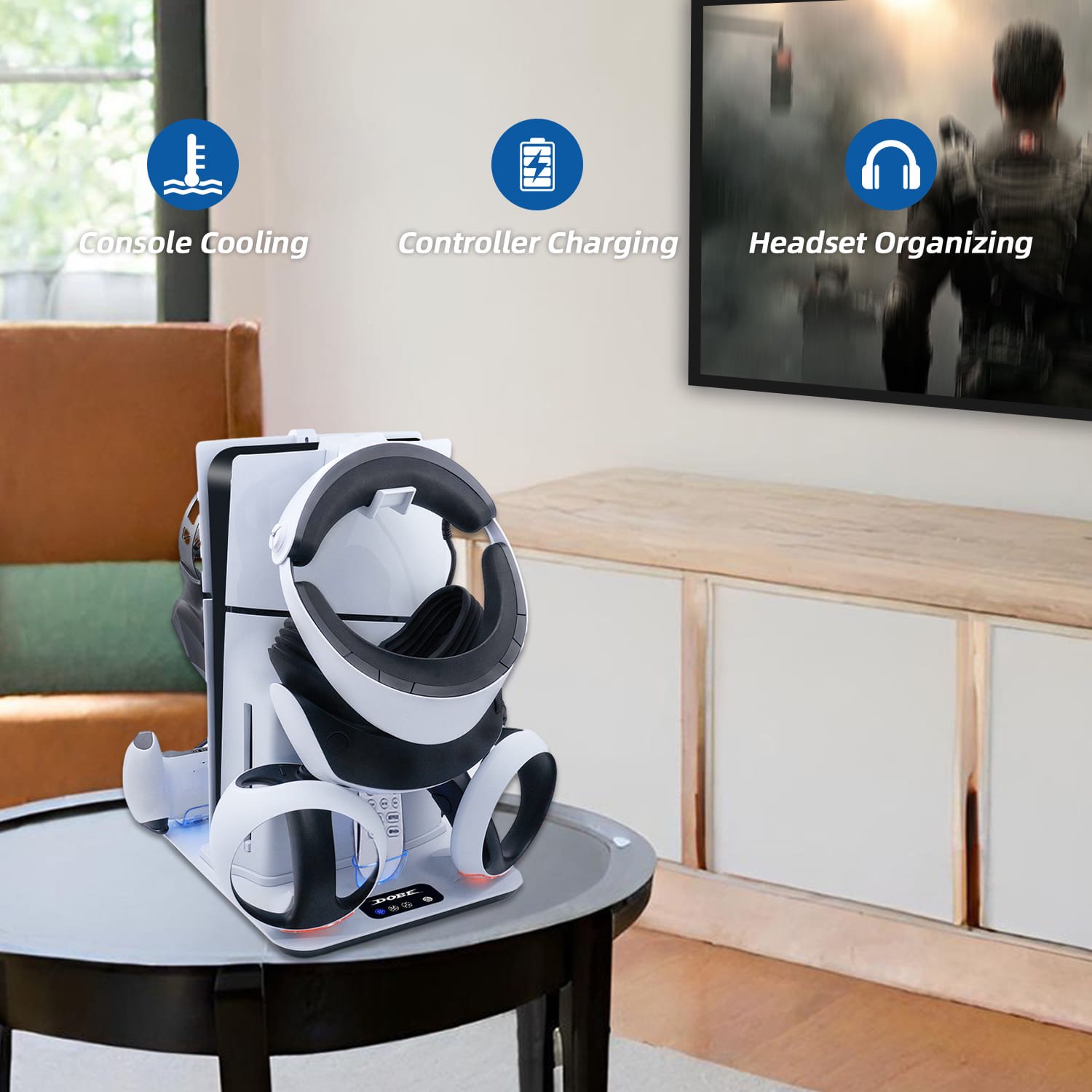 همهکاره: پایه خنککننده، داک شارژ دوگانه برای کنترلرها، نگهدارنده هدست و جای نگهداری دیسک در یک واحد فشرده.
