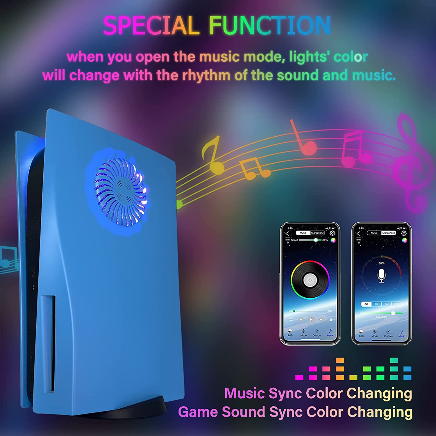 این فیس پلیت دارای نوار LED برای دو طرف کنسول و نوار LED مخصوص منفذ فن کنسول است. این LEDها از ۴۰۰ ترکیب رنگ مختلف پشتیبانی میکنند و به موسیقی نیز حساس هستند. شما میتوانید رنگ و نور این LEDها را با ریموت همراه آن یا اپلیکیشن موبایل LED LAMP تغییر دهید.