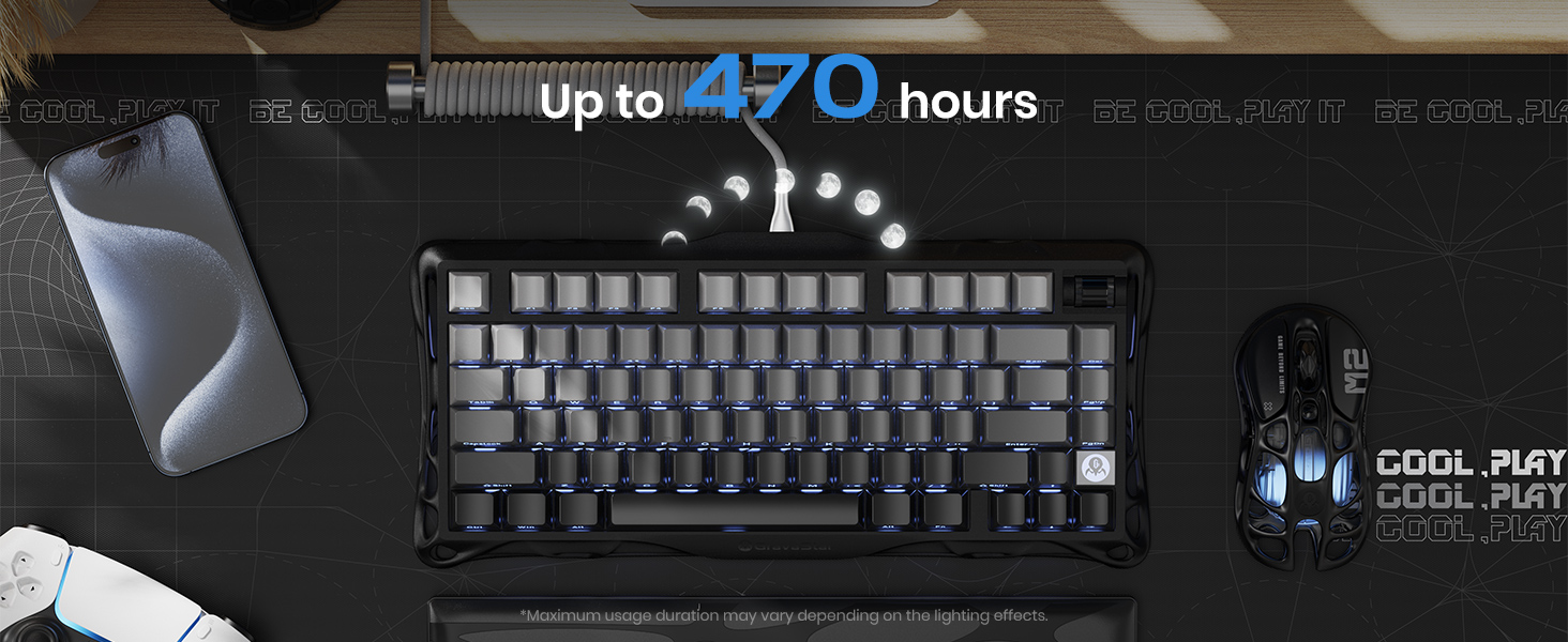 با یک بار شارژ کامل، بسته به شدت نورپردازی و حالت اتصال، تا ۵۰ ساعت کار مداوم را پوشش میدهد. شارژ از طریق درگاه USB-C با کابلی که همراه کیبورد است انجام میشود و در عرض کمتر از دو ساعت ظرفیت باتری تکمیل میشود.