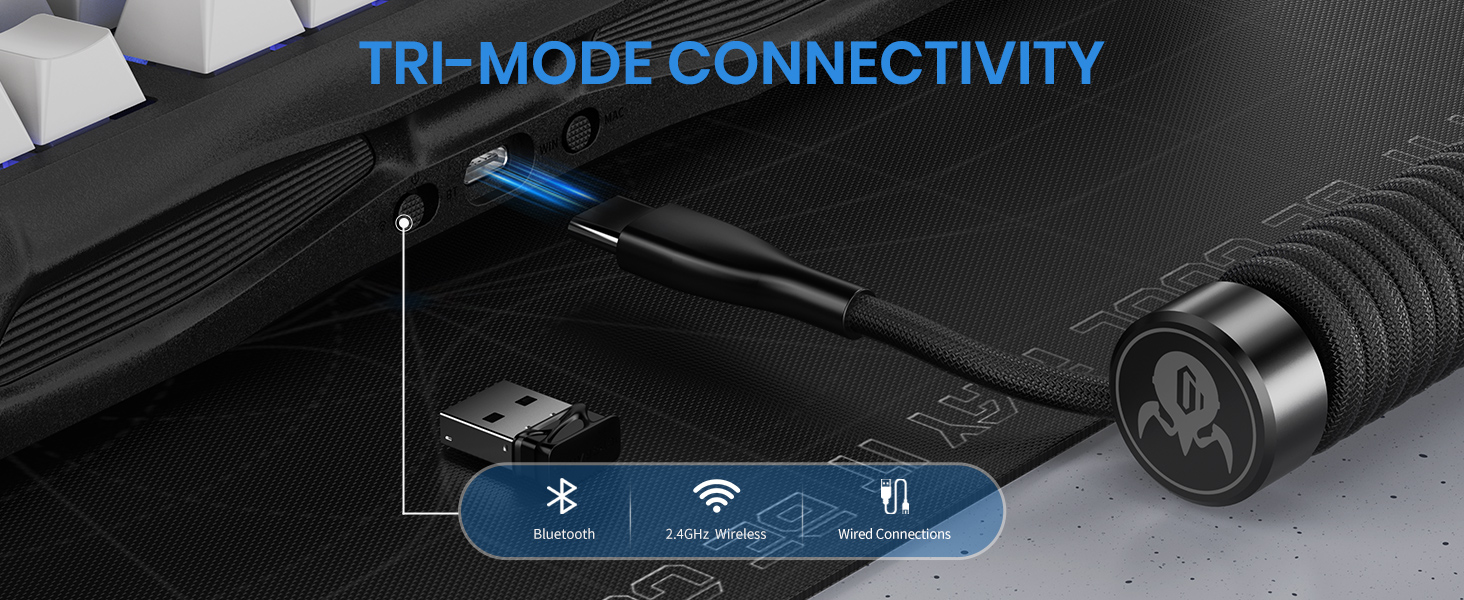 کیبورد GravaStar Mercury K1 از دو حالت اتصال پشتیبانی میکند: بلوتوث و دانگل 2.4 گیگاهرتز USB. در حالت بلوتوث میتوانید همزمان سه دستگاه را به کیبورد متصل کنید و با فشردن سوئیچ دستگاه بین آنها جابهجا شوید. دانگل USB تأخیر بسیار اندک و پایداری بالا در محیطهای شلوغ ارائه میکند و اتصالی بدون وقفه را تضمین میکند.