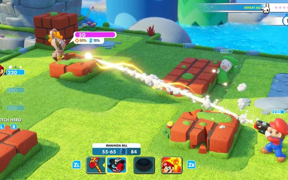 نکته مهم این است که بازی Mario + Rabbids: Kingdom Battle یک بازی استراتژیک واقعا عالی است که ویژگیهای اصلی عناوینی مانند بازی XCOM را به طور هوشمندانهای میگیرد و در عین حال، موانع ورود به این سبک برای تازهواردها را کاهش میدهد و ویژگیهای خاص خود را هم به این ترکیب اضافه میکند. اصول اولیه این است که شما تیمی از سه نفر را از فهرست در حال گسترش تیم خود به نبرد علیه یک گروه از ربیدهای مختلف با امکان یک حرکت، یک حمله و فعال کردن تواناییهای ویژه با تایمرهای خنککننده خود میبرید. این بازی سریع و قابل دسترسی است و به خوبی اصول اولیه (البته سادهشده) یک ژانر اغلب پیچیده را توضیح میدهد. احتمال موفقیت ضربه به دشمنان پشت کاور، به صورت ساده و خلاصه و در قالب سه عدد صفر، ۵۰ یا ۱۰۰٪ نمایش داده میشود در حالی که نوارهای سلامتی و محدوده قدرت سلاح شما نیز به وضوح تعریف شدهاند.
