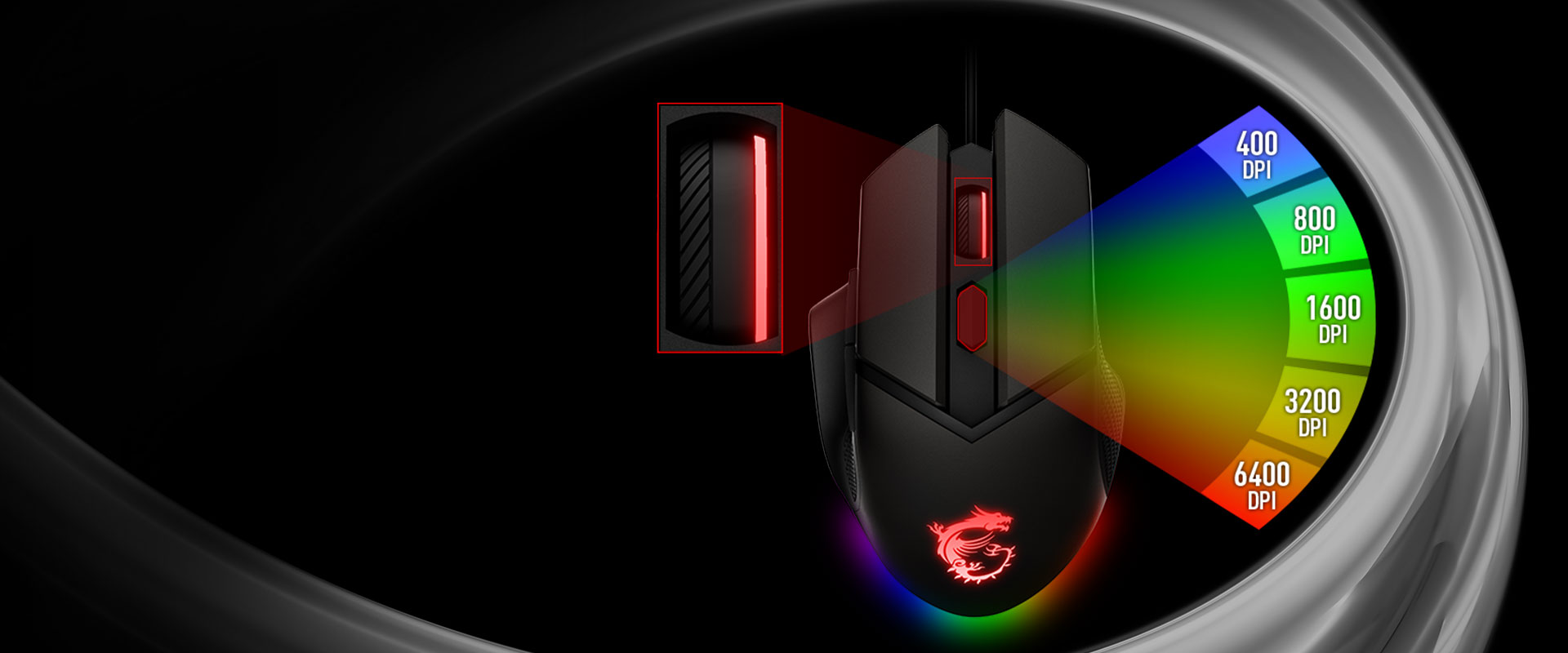 موس MSI Clutch GM20 Elite میگذارد تا زمانی که اسکرول را فشار میدهید، به حالت تنظیم DPI دسترسی پیدا کنید و از میان پنج سطح DPI یکی را انتخاب کنید. به همین شکل و تنها با فشردن یک دکمه میتوانید دقت موس را تنظیم کنید.