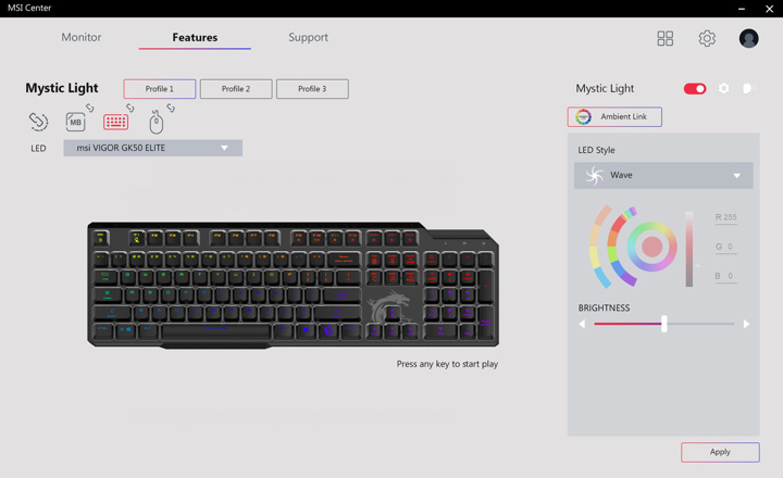 از نظر نورپردازی RGB نیز کیبورد MSI Vigor GK30 نسبت به قیمت اقتصادی خود در سطح خوبی قرار داشته و هفت حالت نوری از پیش تنظیم شده در اختیار کاربر قرار میدهد. تغییر حالت نورپردازی از طریق نرمافزار اختصاصی Dragon Center برند MSI وجود دارد اما اعمال شخصیسازیهای دقیق و جزیی ممکن نیست. فراموش نکنید که نورپردازی RGB کیبورد امکان خاموش شدن نیز داشته و گیمرها با توجه به سلیقه و وضعیت موجود میتوانند روی RGB تنظیماتی اعمال نمایند. در نهایت برای کسانی که به دنبال ایجاد ماکروها و کلیدهای شخصیسازی شده هستند باید گفت که نرمافزار Dragon Center از این نظر چندان عمیق نبوده و تنظیماتی در اختیار گیمرها قرار نمیدهد که قابل قبول نیست.