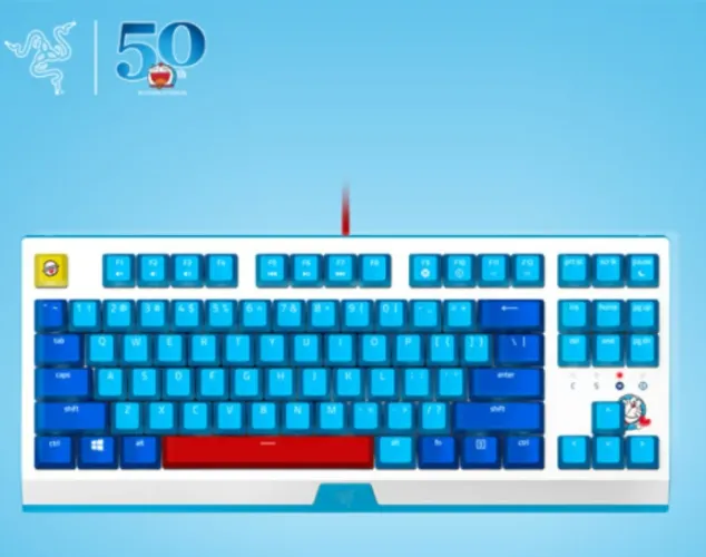 کیبورد Razer Blackwidow X طرح محدود ۵۰ سالگی Doraemon بر اساس نسخه Razer Black Widow Spider X Sport Edition ساخته شده است و از شافت سبز Razer با نور پسزمینه سفید استفاده میکند. بدنه اصلی عمدتا سفید و آبی است و تصویر عمودی Doraemon در بالای کلیدهای جهتنما قرار دارد و ظاهر آن بسیار بامزه است! به علاوه، کلید Esc زرد و کلید Space قرمز است که ظاهری جوانپسند و جذاب به این کیبورد دوستداشتنی میدهد.