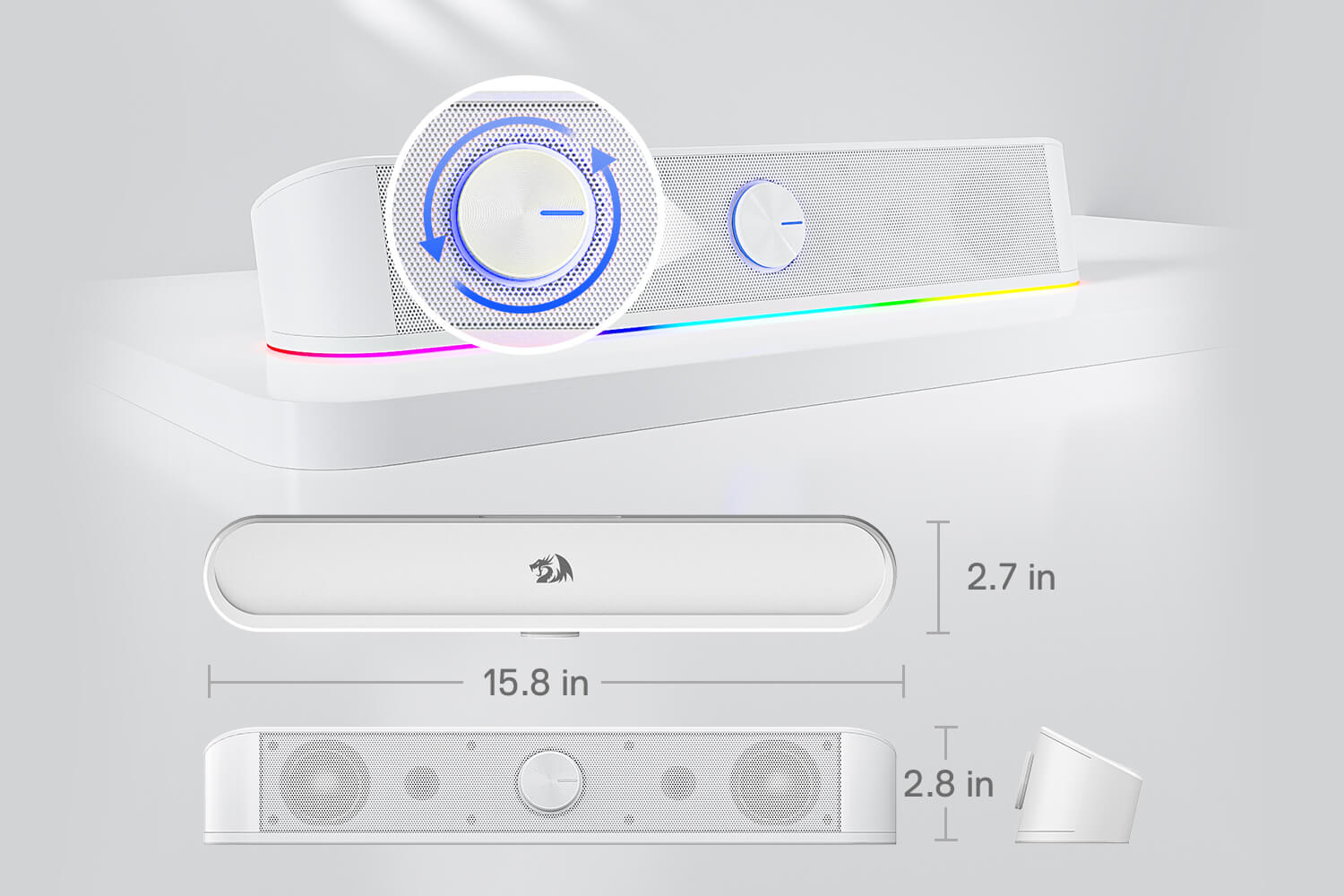 سطح صدای ساندبار Redragon Adiemus و روشن یا خاموش کردن آن را میتوانید از طریق غلتک چرخان آن کنترل کنید و سطح صدا را به دقیقترین شکل ممکن تنظیم کنید.