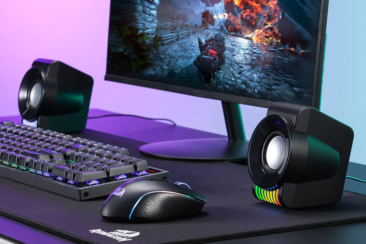 اسپیکرهای Redragon Kage مجهز به نورپردازی چشمکزن RGB در شیارهای زیرین خود هستند و در عین زیبایی بخشیدن به میز کار شما، فضای کافی برای قرارگیری سایر لوازم جانبی روی میز شما و انجام کارهای روزمره فراهم میسازند.