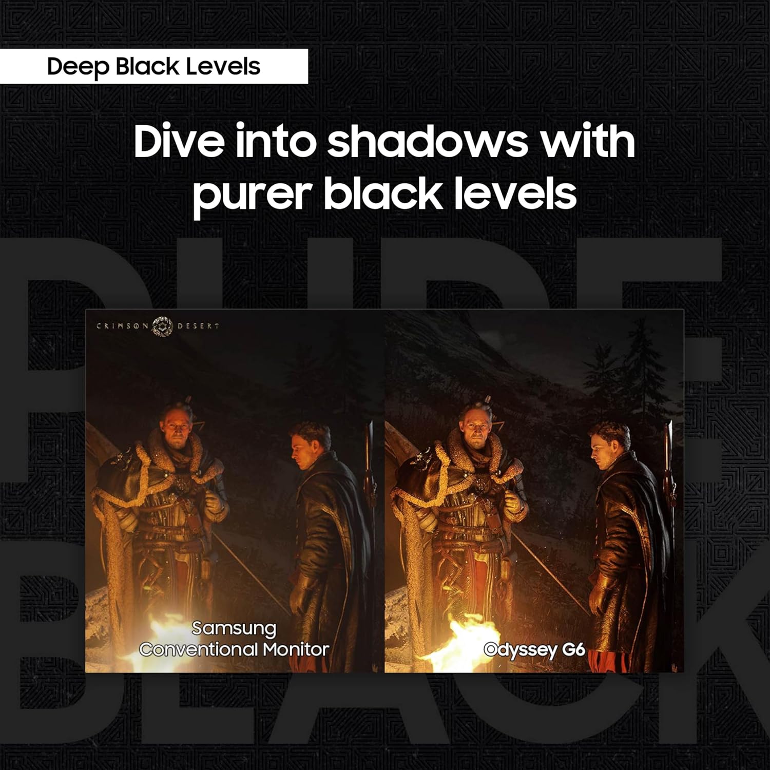 پنل اولد مانیتور Samsung Odyssey OLED G6 دارای میزان رنگ سیاه عمیقی است که تمام طیفهای این رنگ را از هم تفکیک میکند تا در نواحی تاریک و پر از سایه تصویر نیز بتوانید جزئیات صفحه را به خوبی تشخیص دهید.