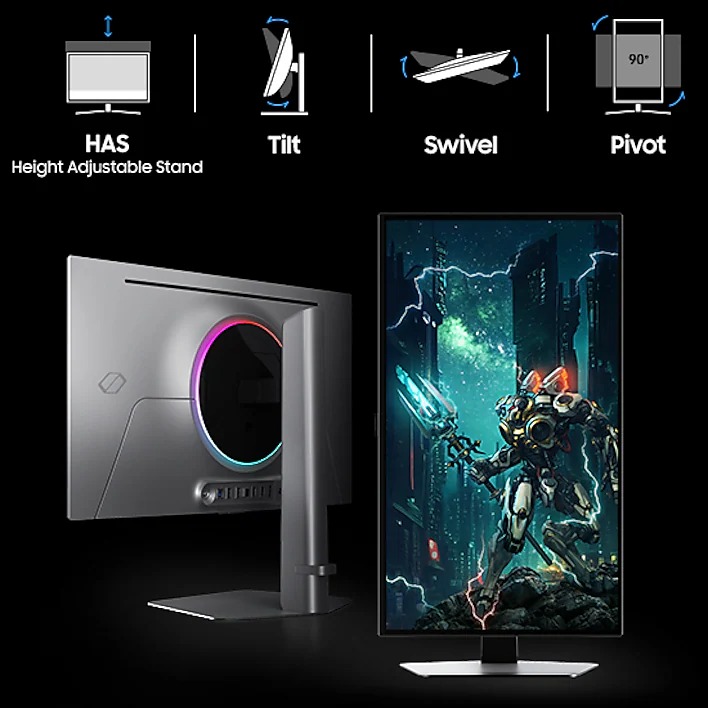 مانیتور Samsung Odyssey OLED G6 دارای ارتفاع قابل تنظیم و قابلیت چرخش در چهار جهت است و میتوانید از آن به صورت عمودی نیز استفاده کنید.