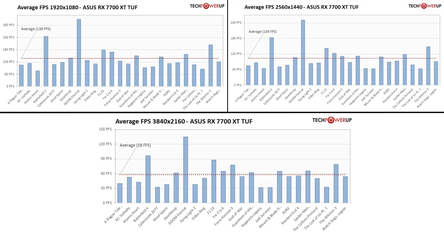حال که با قابلیتهای این کارت گرافیک آشنا شدید، وقت آن است که به سراغ بررسی عملکرد آن برویم تا ببینیم این کارت گرافیک AMD چه حرفی برای گفتن دارد. ما برای تست این کارت گرافیک از بنچمارکهای سایت TechPowerUp استفاده کردهایم. سیستم مورد استفاده برای بررسی عملکرد کارت گرافیک Sapphire PURE Radeon RX 7700 XT از پردازنده Intel Core i9-13900K، مادربرد EVGA Z790 Dark و 32 گیگابایت رم DDR5 با سرعت 6000 مگاهرتز بهره میبرد تا جای نگرانی برای ایجاد گلوگاه وجود نداشته باشد. در ادامه میتوانید نتایج بنچمارک این کارت گرافیک را در بازیهای مختلف مشاهده کنید: