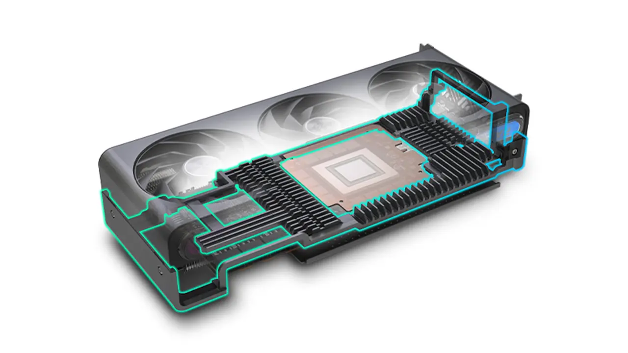تیغههای فن این کارت گرافیک از طراحی Angular Velocity بهره میبرند که به دلیل شکل خاص پرهها، هوای بیشتری به سمت پایین با فشار وارد میشود و تا 19 درصد جریان هوا افزایش پیدا میکند. همینطور این کارت گرافیک از یک صفحه پشتی تمام آلومینیومی بهره میبرد تا خیال شما را از بابت خم شده کارت گرافیک راحت کند و همچنین گرد و غبار را بیرون نگه میدارد.
