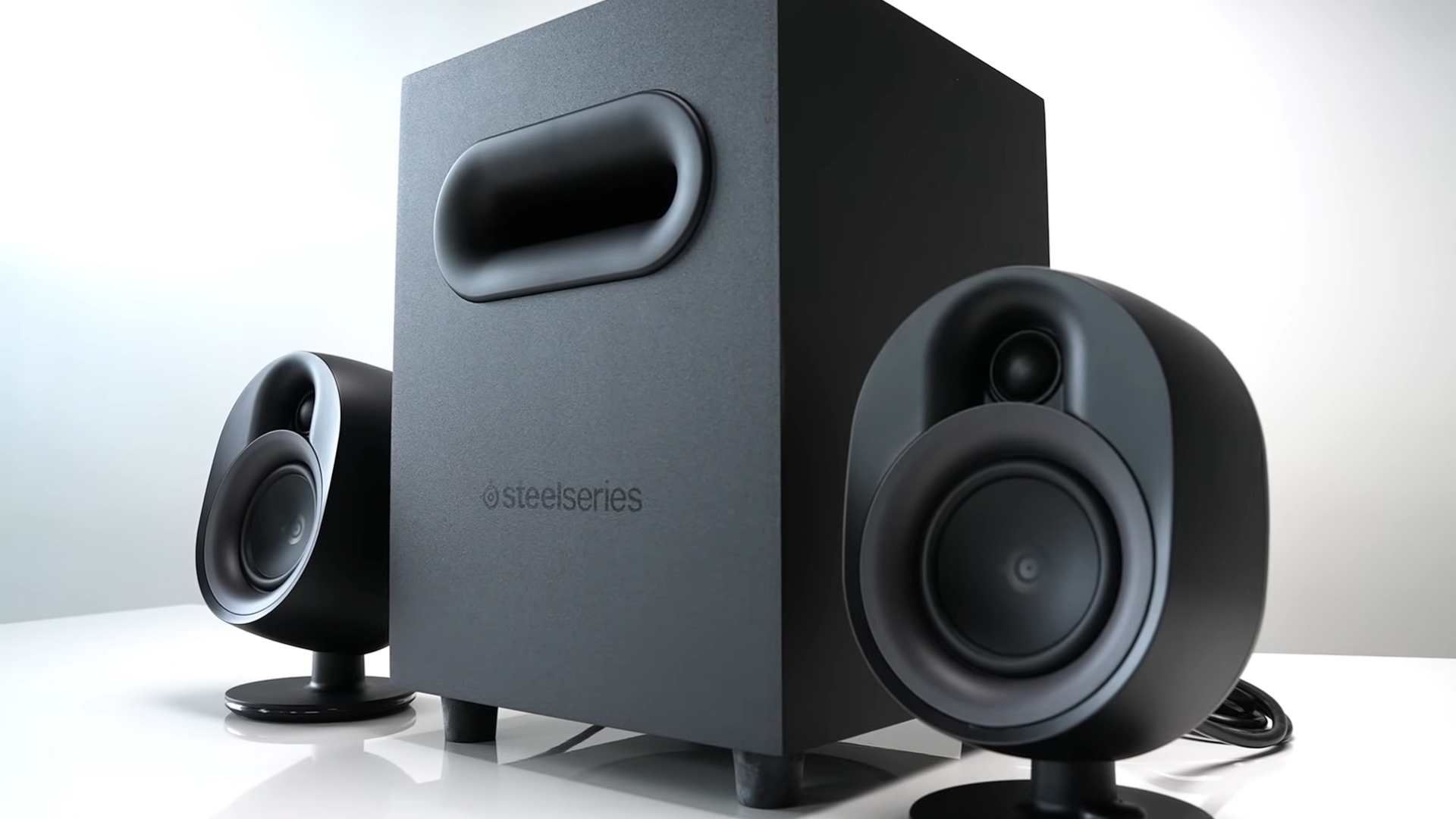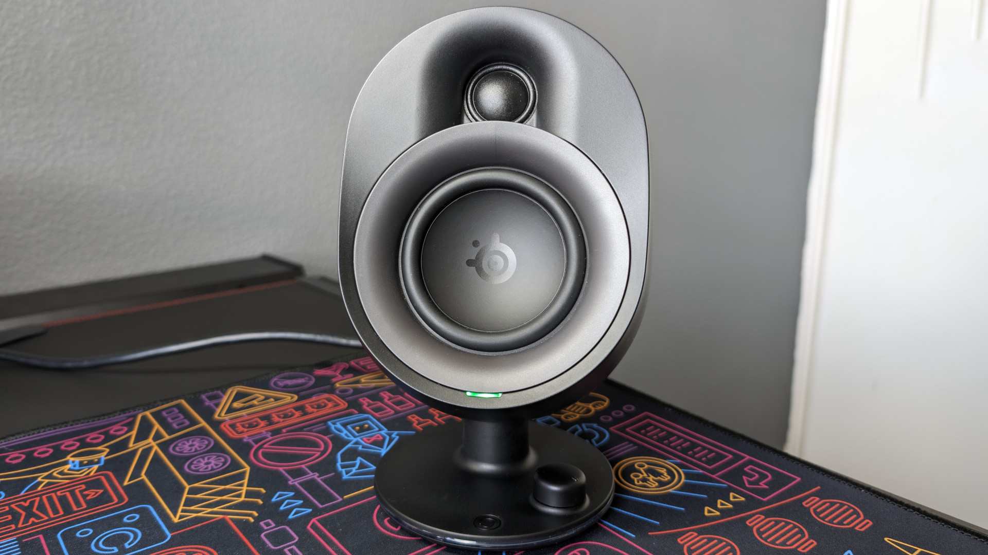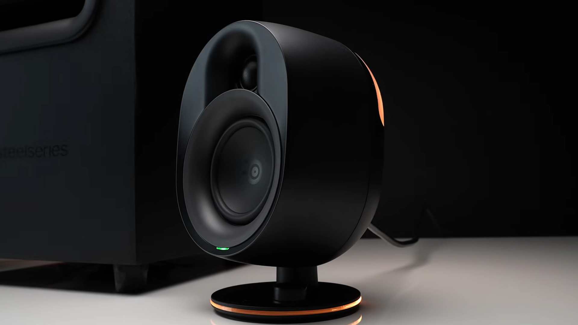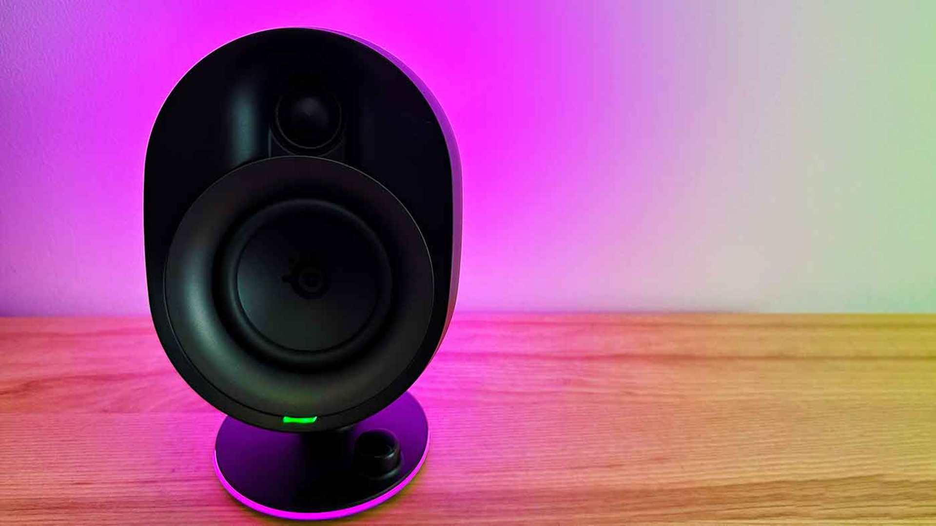 اگر برایتان سؤال است که هنگام کار عادی روزمره یا تماشای فیلم معمولی، چه باید کرد، راهکار سادهای وجود دارد: میتوانید نورپردازی را کاملاً خاموش کنید. از طریق دکمه چندمنظوره روی یونیت سمت راست، این کار در عرض چند ثانیه انجام میگیرد. این دکمه برای کاربردهای دیگری مانند فعالسازی بلوتوث (Bluetooth) یا قطع سریع صدا نیز در نظر گرفته شده و عملاً نقش مرکز کنترل اسپیکر را ایفا میکند. افزون بر این، امکان همگامسازی نورها با سایر تجهیزات استیلسریز (SteelSeries) نیز فراهم است. اگر ماوس یا کیبورد استیلسریز دارید که از PrismSync پشتیبانی میکنند، میتوانید یک محیط نورپردازی یکپارچه بسازید که تمام تجهیزاتتان بر اساس یک الگوی رنگی خاص عمل کنند. این ویژگی ممکن است برای بسیاری از علاقهمندان گیمینگ که عاشق هماهنگی بصری هستند، دلیل کافی جهت خرید باشد.