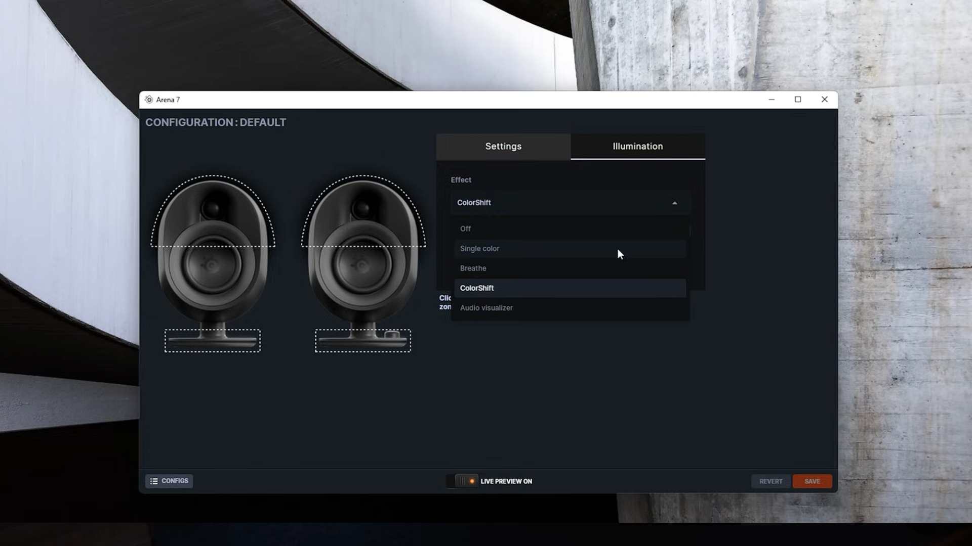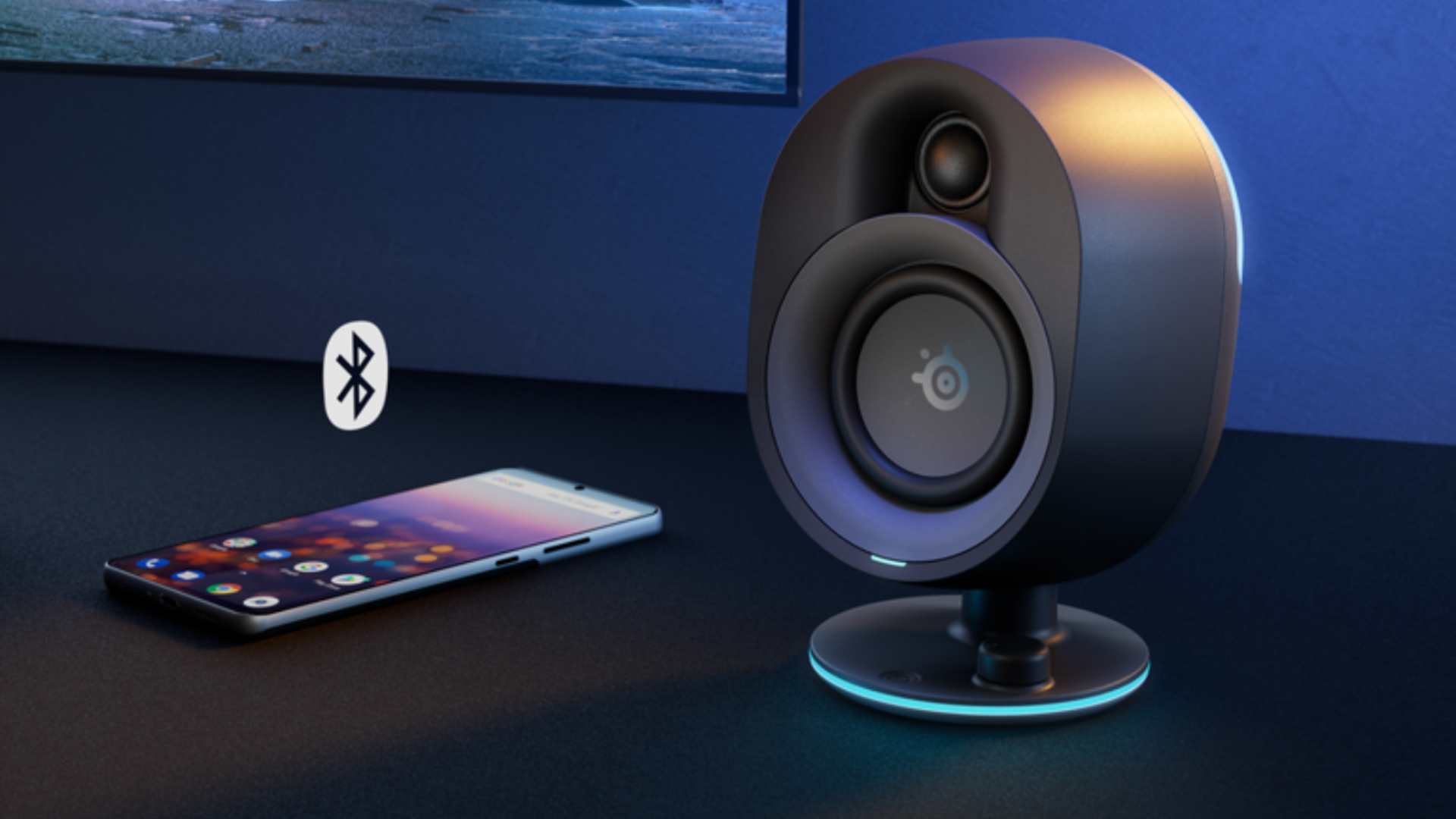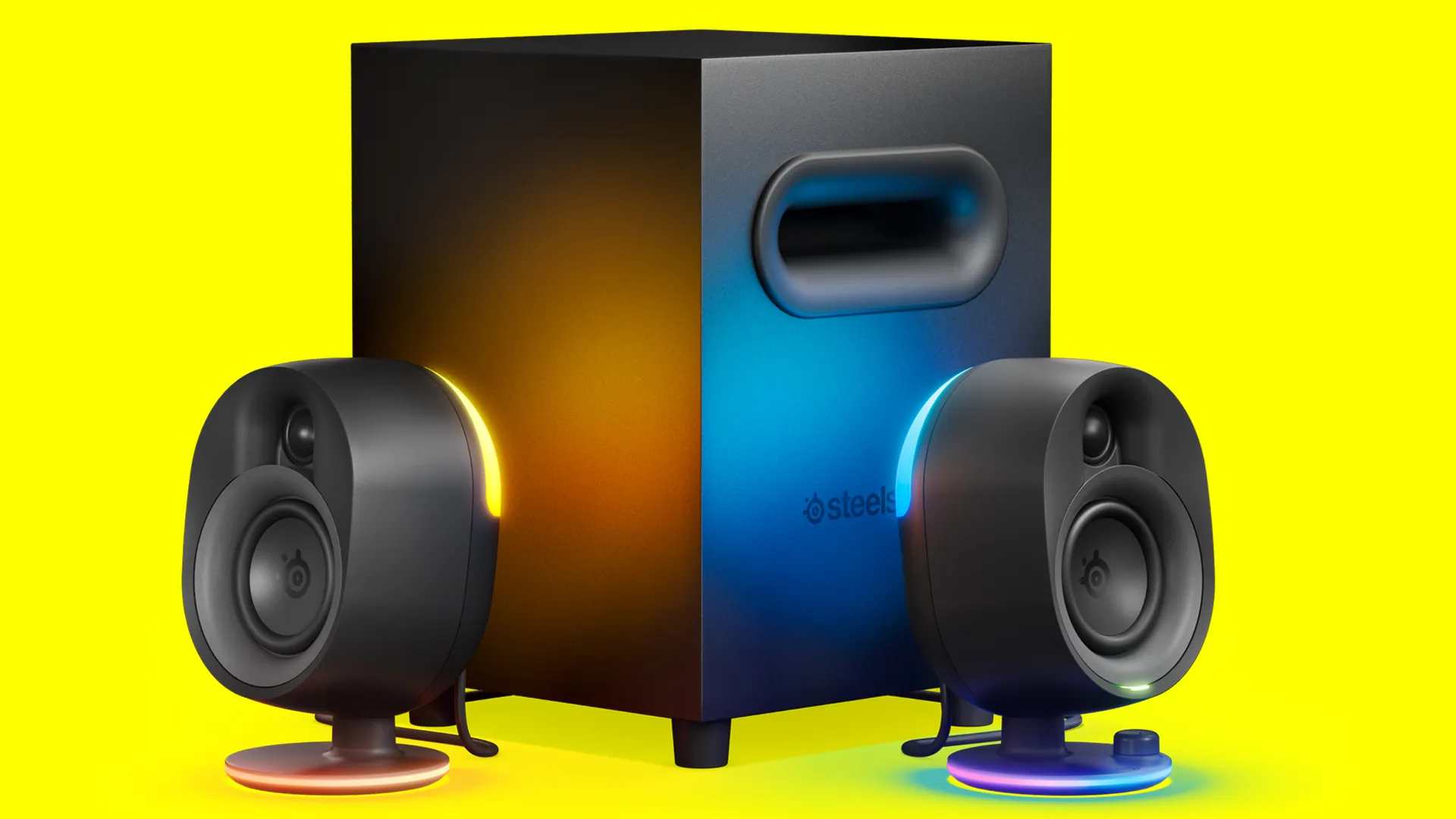 امروزه در دنیای گیمینگ، نورپردازی RGB به یکی از مؤلفههای ثابت محصولات الکترونیکی تبدیل شده است. اسپیکر SteelSeries Arena 7 هم از این قاعده مستثنا نیست. چهار منطقه نورپردازی در این محصول تعبیه شدهاند: دو بخش روی پایههای یونیتها و دو بخش در پشت آنها که نور را به دیوار پخش میکنند. این نورپردازی با استفاده از نرمافزار جیجی (GG) قابل شخصیسازی است و میتوان ریتم یا طرح رنگ موردنظر را انتخاب کرد.